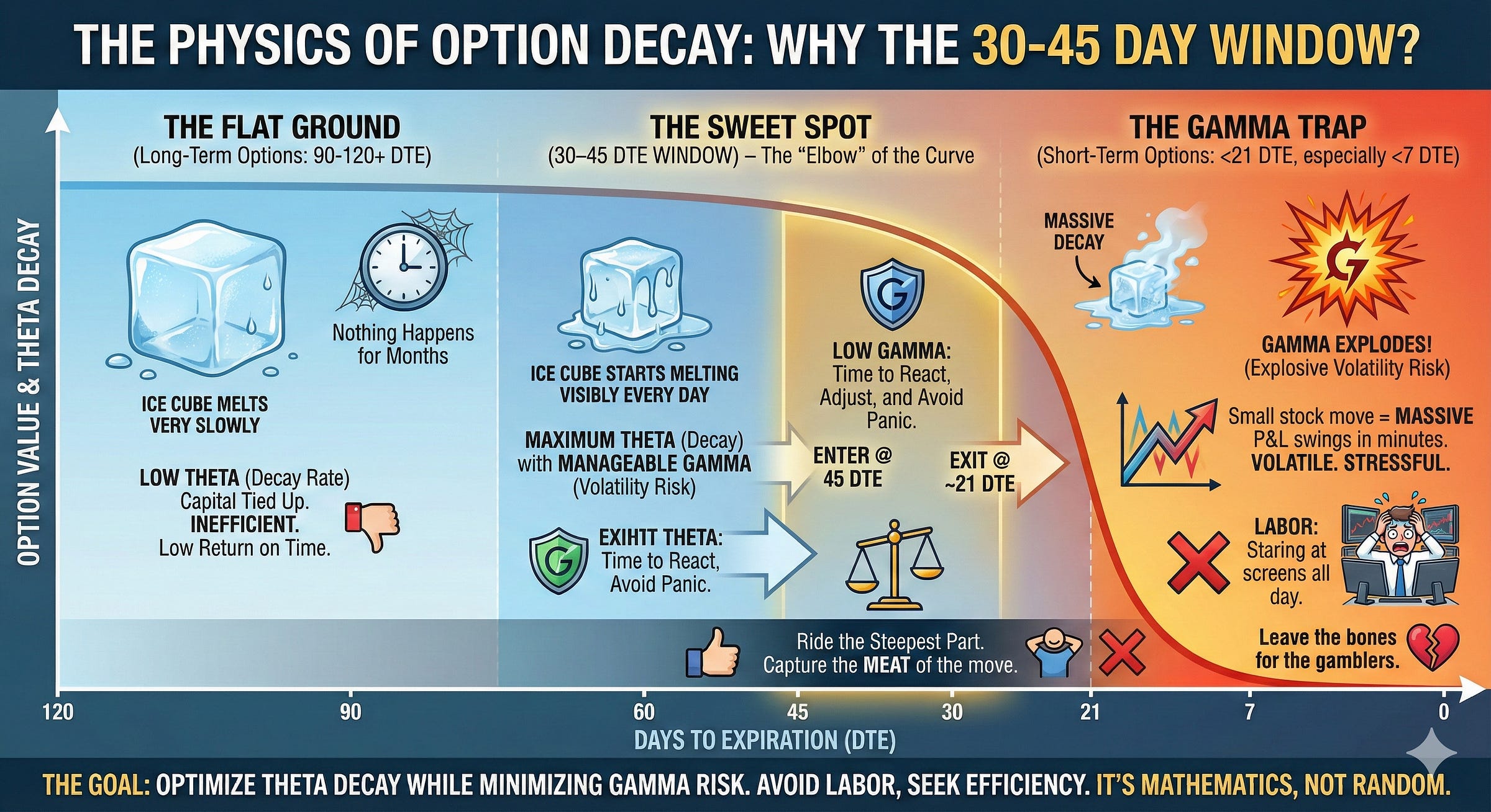 The 30-45 DTE window is the “elbow” of the curve.