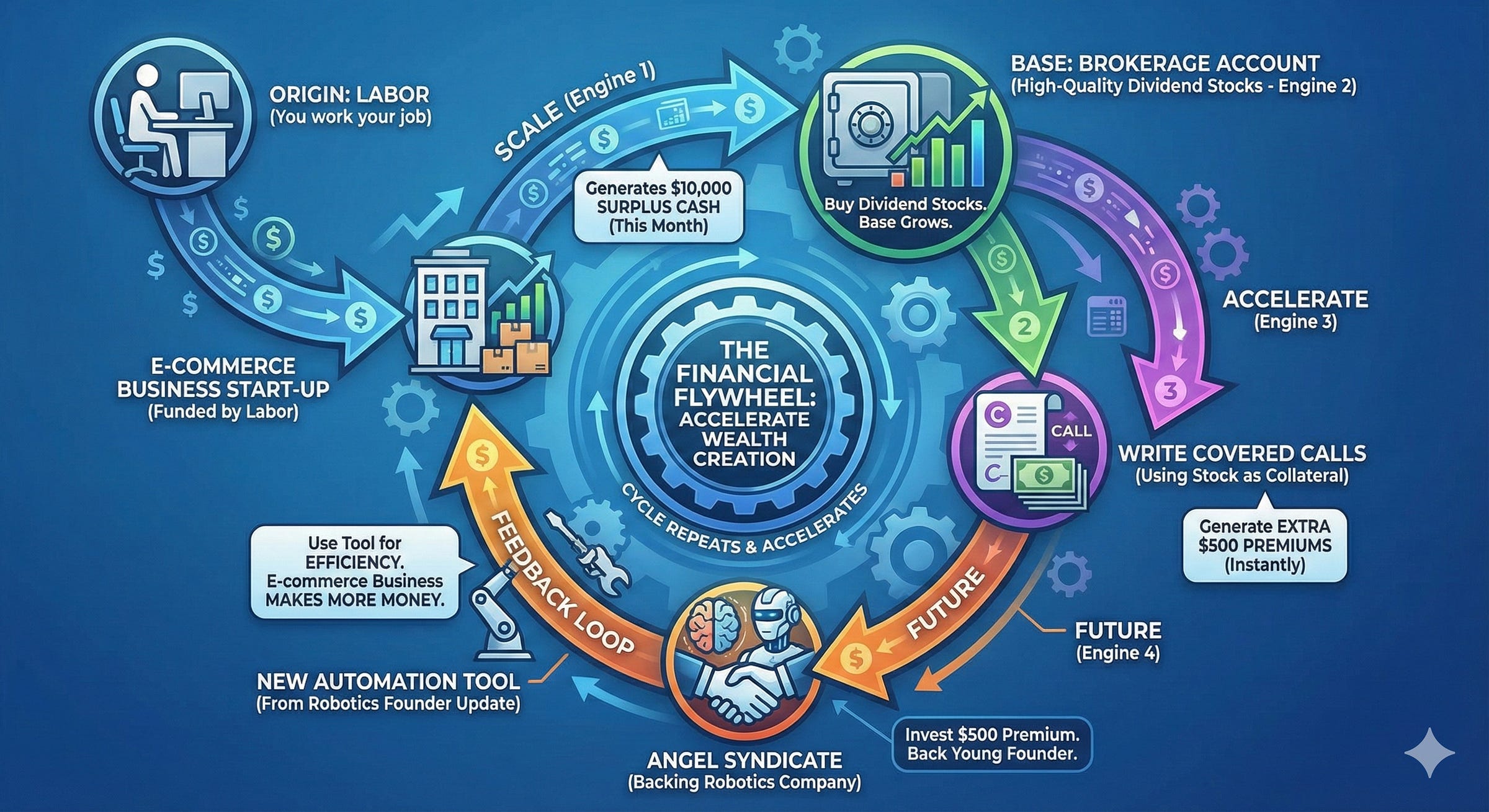 These engines are wealth generators. They run simultaneously. They feed each other. They are designed to decouple your financial output from your physical input.